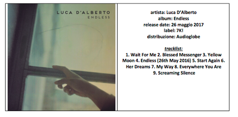 La musica di Luca D’Alberto è emozione allo stato puro: guidato da linee di piano ed accordi di violino, “Endless” è un tuffo in territori lontani, in panorami cinematografici ed eterei.